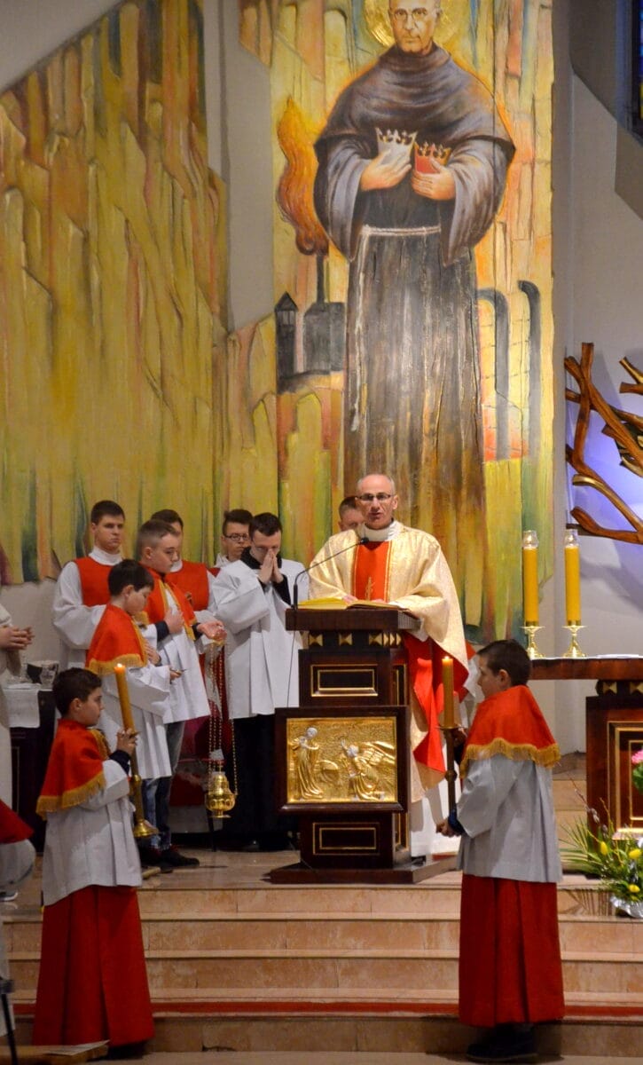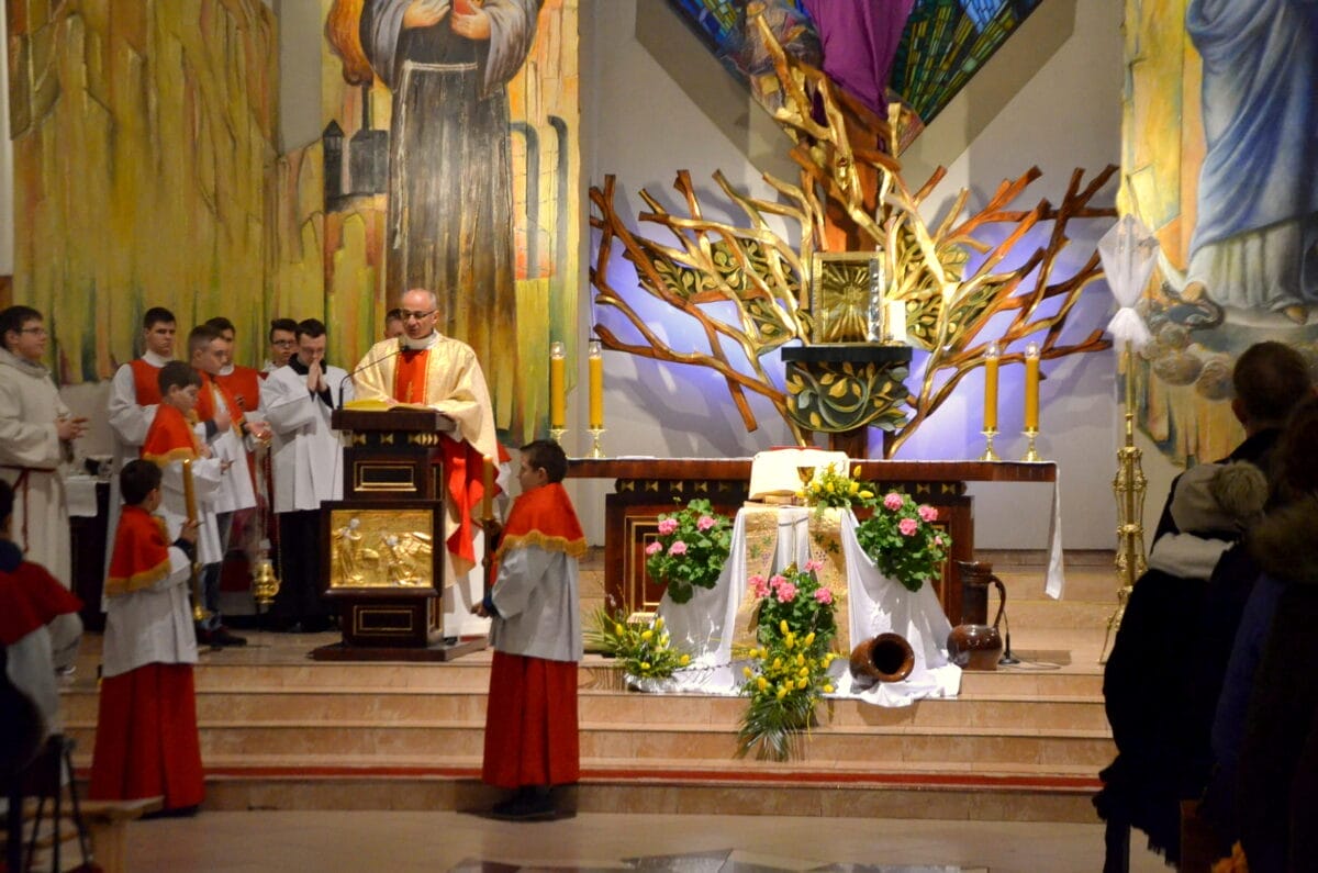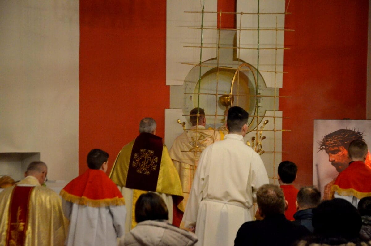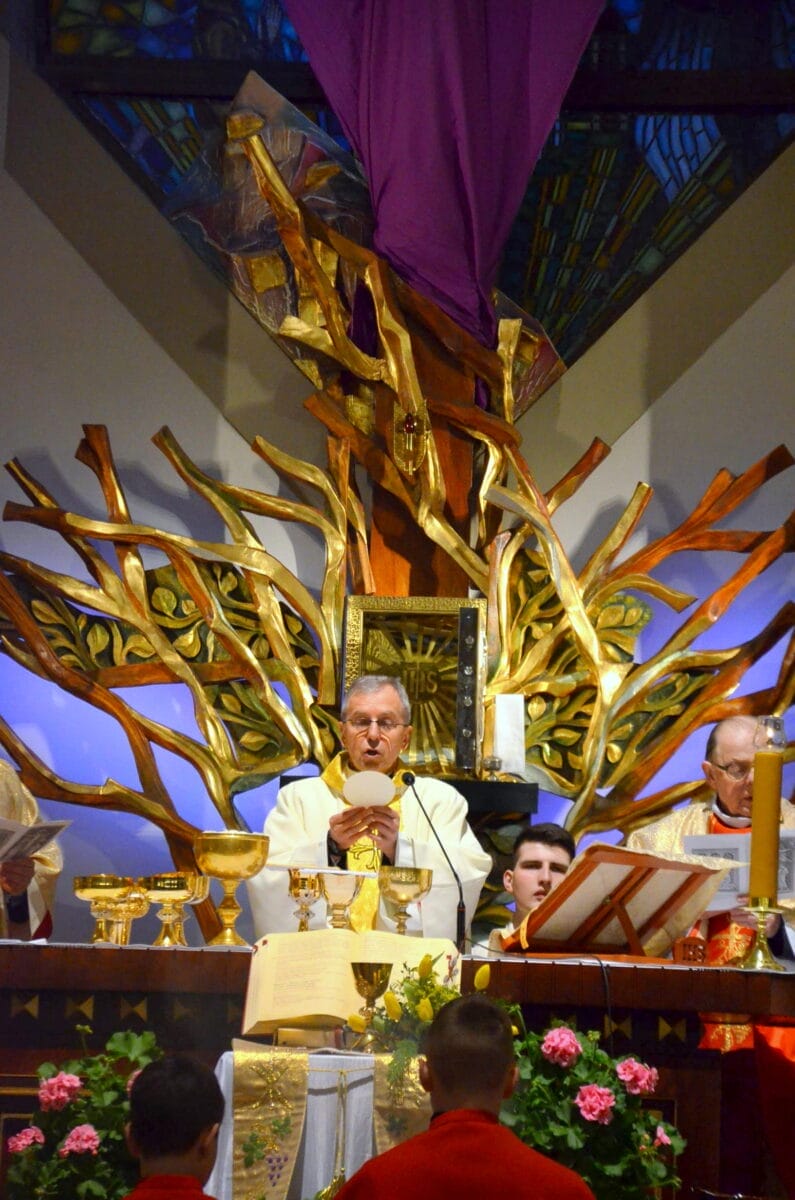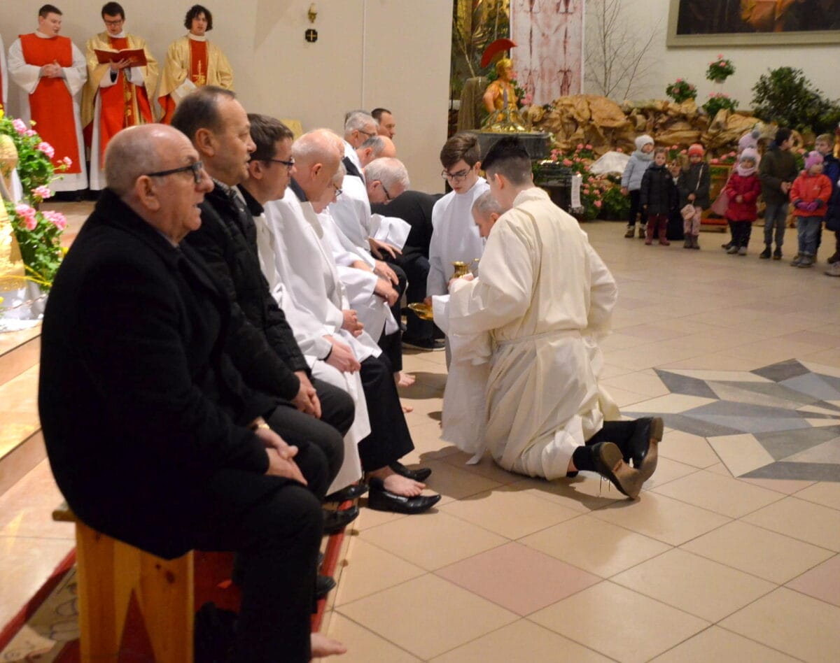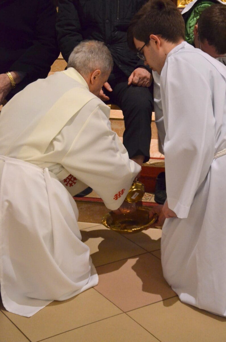 Wieczorem w Wielki Czwartek odprawiana jest uroczysta Msza Wieczerzy Pańskiej, która rozpoczyna Triduum Pachalne. Sprawowana jest na pamiątkę Ostatniej Wieczerzy, podczas której Jezus Chrystus ustanowił w obecności swoich apostołów sakrament Eucharystii oraz sakrament kapłaństwa. W trakcie mszy śpiewany jest hymn „Chwała na wysokości“, któremu towarzyszy bicie wszystkich dzwonów i gongów w kościele. Po jego zakończeniu, aż do mszy Wigilii Paschalnej odprawianej w Wielką Sobotę wieczorem, zamiast stalowych gongów i dzwonów stosowane są drewniane kołatki. Na zakończenie mszy Najświętszy Sakrament przenoszony jest do kaplicy symbolizującej więzienie, do którego wtrącony został Chrystus po Ostatniej Wieczerzy.
